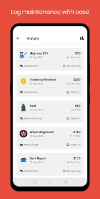 Track servicing, oil changes, repairs, and parts replacement to extend vehicle life.