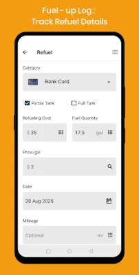 Log refuels, monitor fuel consumption, and track fuel costs in detail.