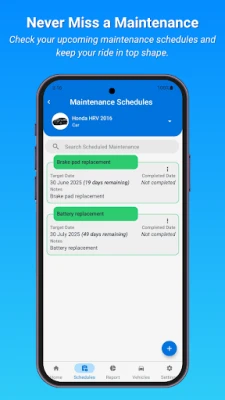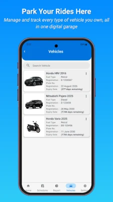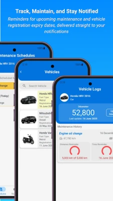 - Get reminders for upcoming maintenance and vehicle registration expiry dates