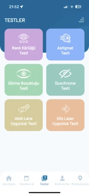 Göz sağlığınızı kontrol altında tutmak için düzenli olarak yapmanız gereken göz testlerini uygulama üzerinden kolayca gerçekleştirebilirsiniz. Uygulama, görme keskinliğinizi test etmenize ve sonuçlarınızı kaydetmenize yardımcı olur.