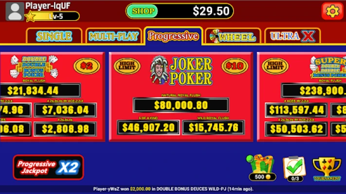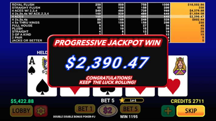 * Progressive Jackpot - Win millions of coins with Royal Flush.