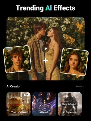 Trending AI Effects: Explore viral templates like AI Anime, AI Hug, AI Dance, and more! Create unique, eye-catching AI videos that stand out on TikTok, Instagram, and Facebook.