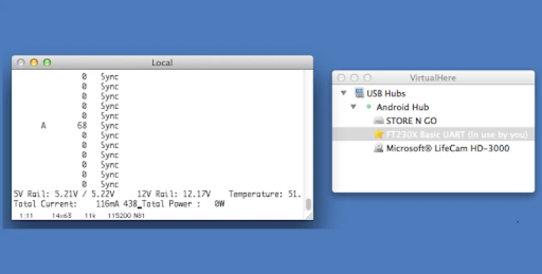 The next screenshot shows a Apple Mac machine accessing a FTDI serial device that is plugged into a remote android device. ie. serial over IP