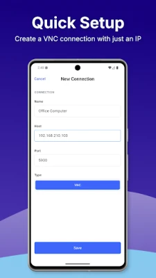 Set up your connection in seconds: enter a name, host/IP address, and port (default 5900), then connect with your VNC password. Save multiple devices, search by name or IP, and jump back into your sessions anytime.