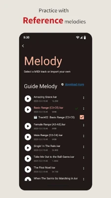 Import MIDI or KAR music files and let the app automatically detect the main melody track. Lyrics from KAR files are matched and synced, giving you a guided melody line plus real-time vocal monitoring.