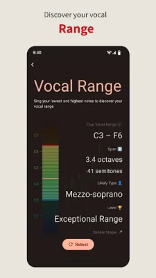 Measure your complete vocal range any time. Discover your lowest and highest notes and track progress as your voice develops.