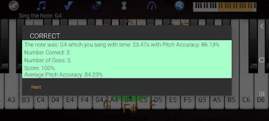 • The piano keys highlight showing which note you should sing and which pitch you are correctly singing.
