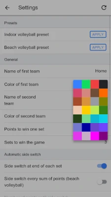 • Use the settings to configure points, sets, tie-breaks, colors and side switches.