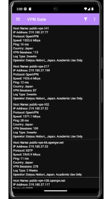 This app allows you to find and sort the list of servers available with the protocol OpenVPN TCP, OpenVPN UDP, or SSTP. Easy to use with just one click. Your traveling VPN companion.