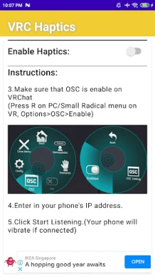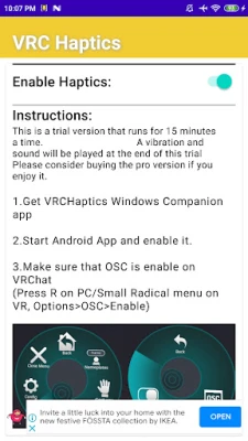 This application is to use with it's desktop companion app to communicate data from VRChat desktop to the phone. The desktop application receives OSC interaction messages from VRChat and sends over signals to vibrate the phone. This is a trial version that only last for 15mins per session, Do consider buying the Plus version in the future if you enjoy it.