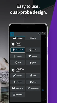 Without a cord to get in the way, Vscan Air VET app users are given quick access to scanning capabilities, with user-friendly controls and functionality. Quickly access presets and select those most closely aligned to conduct exams for various animal species, including canines, felines, equines, bovines, ovines, porcines, caprines, and even exotic animals like small mammals, reptiles, and birds.