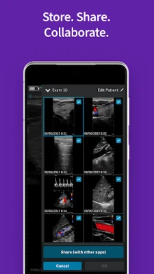The Vscan Air VET app also offers easy access to image storage and sharing capabilities. Enjoy the flexibility of a wireless experience with wireless device connectivity and data sharing to your DICOM® Network server or shared folders. Easily share anonymous exam images or loops to other apps, including your social feed, with just a few taps. Easily export anonymous JPG/MPG files with other apps, colleagues, and even pet parents, all without the need for a cloud service.