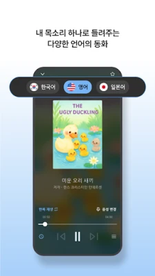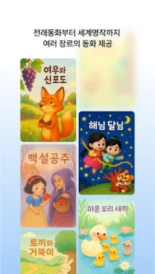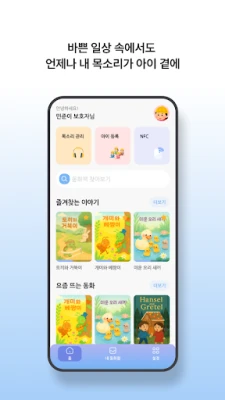 [주요 기능] 1. 간단한 녹음만으로 생성하는 동화 음성 2. 다국어 음성 지원 : 한국어·영어·일본어 지원 3. 맞춤형 플레이어 : 음성 변경, 반복 재생, 수면 타이머 기능 4. 아이 연령에 딱 맞는 동화 추천 5. 전래동화부터 세계명작까지 다양한 장르의 동화 제공 6. 아이가 실수로 조작하지 않도록 하는 안전 보호 설정