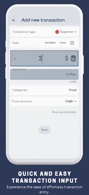 Quickly log purchases, bills, and other expenses in just a few taps. Categorize transactions for better organization and get a clear overview of where your money is going.