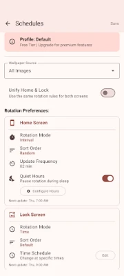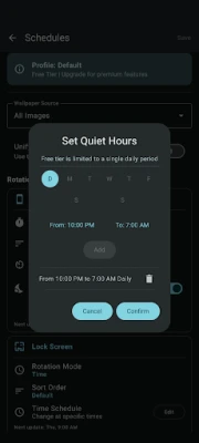 🌙 Granular Quiet Hours Don't waste battery or burn through wallpapers while you sleep. Set specific "Quiet Hours" (e.g., 11 PM to 7 AM) to pause wallpaper changes automatically. Your schedule resumes seamlessly when you wake up or when your focus time ends.