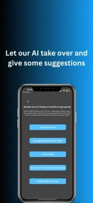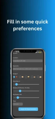 -Ask up to 15 times daily for recommendations -Set your location, age range, how far you're willing to travel, and how much you'd like to pay -Choose between breakfast, lunch, dinner, or dessert for dining options -Add custom keywords to enhance your search (coffee, parks, etc) -Get a list of recommendations, tap on one to get directions