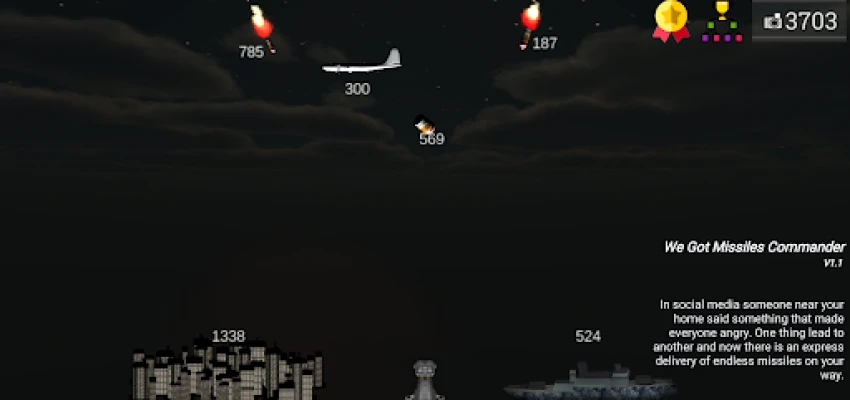 In social media someone said something that made everyone angry. One thing has lead to another and now there is an express delivery of endless missiles on their way. When there is no other options the only thing to do is to fight to the last breath. Fire missiles against enemy missiles, bombs and airplanes and protect your towns and towers until the inevitable end.