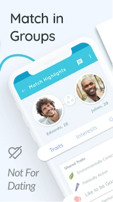 Using social science and machine learning 🤖, our matching algorithm incorporates hundreds of factors in the process. Meaning that when you meet local people from your groups, you are super likely to get along. See each group's overall compatibility 👀, from mutual quirks to shared life goals 🏁.