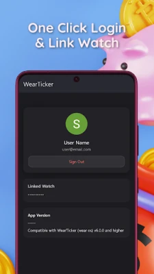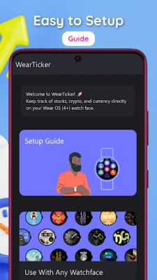 The watch face shown in the screenshots is available separately under the name “Watchface for WearTicker” on the Play Store.