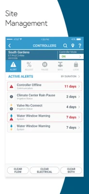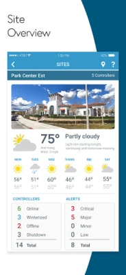 • Get an overview of your site that includes a 7-day weather forecast and current alerts and controller statuses.