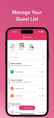 Easily manage your wedding guests — add +1s, track RSVPs, meal preferences, and attendance for every event: engagement party, wedding ceremony, reception, and more.