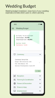 All expenses are organized by wedding categories—venue, attire, catering, decor, and more—for easy tracking.