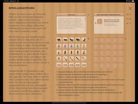 In jedem Level bekommen Sie eine neue Aufgabe gestellt. Zur Lösung stehen Ihnen insgesamt 25 Spielsteine zur Verfügung. Nach der Neuanordnung werden Sie in der Lage sein eine finale Frage zu beantworten und das Level zu lösen. Ein Timer misst Ihre benötigte Zeit pro Spiel, diese wird in einen persönlichen Highscore übertragen. Sollten Sie einmal ein Rätsel nicht lösen können, steht Ihnen in jedem Level eine Hilfefunktion zur Verfügung.