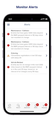 App features • Quick Search – search for vehicles, drivers, and contacts • Fleet Alerts – view alerts when an aspect of your fleet needs attention • Fleet Requests – submit requests for common issues and attach supporting photos • Approve Repairs – receive push notifications and approve pending repairs to get your vehicles back on the road • Vehicle and Contact Details – view detailed information on vehicles and contacts • Face ID/Touch ID – biometric login allows for simple and secure authentication