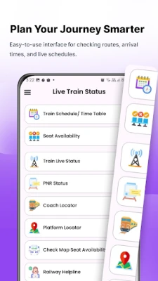 Live running train status, time tables, station status, PNR enquiry, a unique berth & seat calc, and reservation date calc for Indian Railways on our app Where is my Train.