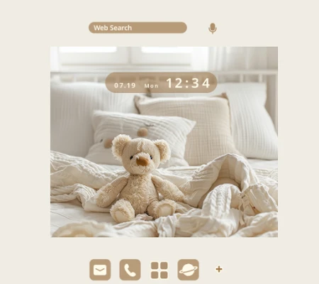 A theme featuring a relaxing wallpaper of a teddy bear plushie and bedroom, along with simple flat icons and widgets that can be customized.