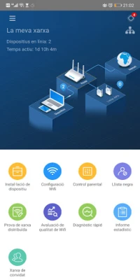 Les funcions més destacades de l'aplicació inclouen: · Configuració de franges horàries per l’activació o desactivació del senyal wifi. · Gestió de la xarxa wifi, control parental, creació de xarxes wifi de convidats o llistes negres, proporcionant-te el màxim control sobre les teves xarxes i dispositius connectats.. · Diagnòstic ràpid de la connexió de xarxa i dels elements de la xarxa wifi.