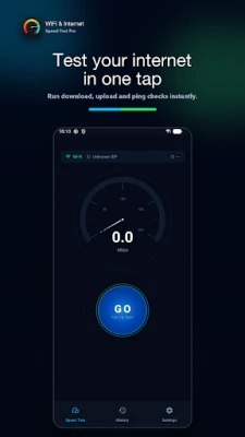 Tap GO and get your full network diagnosis in seconds — download speed, upload speed, ping, jitter, and packet loss — all displayed on a beautiful real-time speedometer.