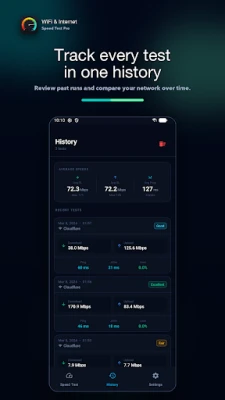Every test is saved automatically. Review your history with average and max download/upload speeds and average ping across all tests. Connection quality is rated as Excellent, Good, Fair, or Poor based on your results.