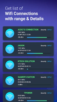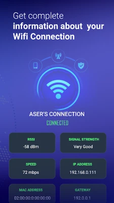 - Know your signal strength of your connected Wi-Fi. - Details of Wi-Fi connection like MAC address, SSID, BSSID, RSSID, Ip address etc. - Get full details of available nearby Wi-Fi networks. - Check connected Wi-Fi network speed and performance. - Save speed test history and data.