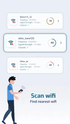 2). WiFi scan: Scan nearby available WiFi connections & their information like frequency, signal strength, channel number, signal health, secure connection, etc.