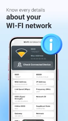 Dive into detailed connection data, from SSID & BSSID to security types, signal-to-noise ratio & more.