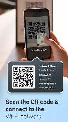 Connect to networks instantly via QR code or generate your own to share Wi-Fi securely & easily with others.