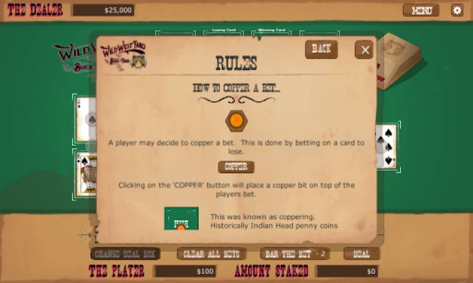 The rules of this version of the Faro card game are similar to the original. The betting layout consists of a suit of Spade cards, from Ace up to King. Players would bet on the card of their choice or multiple cards. The dealer would then exposes cards in pairs, a winner and a loser card, the dealer would then pay out or collect accordingly depending on whether you won or lost. Wild West Faro allows you to place several different types of bet, such as bet on the High Card, a parlay bet, a single bet card or multiple bets on several different cards to either win or lose, when betting on a card or cards to lose, this is known as coppering the bet. You can place as many bets as you want before dealing, betting from $1 to $1 million in an effort to break the bank by winning all of the Dealers money!
