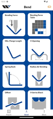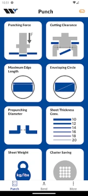 Punching: • Punching force • Cutting clearance • Maximum edge length • Enveloping circle • Pre-punching diameter for countersinks and tapping • Sheet thickness conversions • Sheet weight • Cluster saving Bending: • Bending force • Minimum flange length • V-opening • Spring-back • Radius air-bending • Offset • V-Series Black set-up • Box height • Free space • Bend deduction • Bump bending • Guillotine shearing force • Tool weight Wilson Tool is the global leader in making punching and press brake tools for the sheet metal industry. With more than half a century of expertise in finding solutions for customer challenges and creating innovative products, this app is the result of that experience.