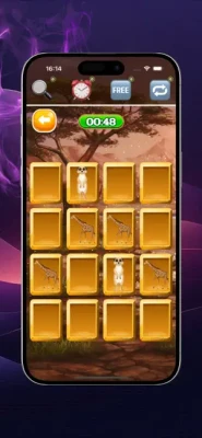 Each level presents a 4×4, 5×5, or 6×6 grid. Match all pairs before time or moves run out to earn coins and stars. Replay levels to improve your score.