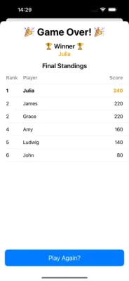Convenient "Play Again?" feature on the Game Over screen pre-fills player names and count for the next setup.