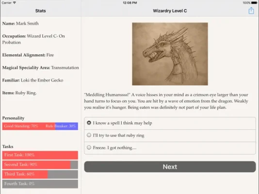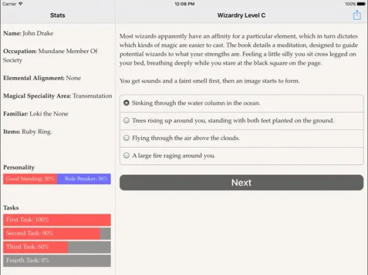 • Choose your name, gender, elemental alignment and area of magical focus. • Explore worlds both on and off Earth, full of magical creatures. • Track your standing with the wizardry guild and your success in completing the tasks they set. • Good replayablity with branching story lines and over 19 different endings. • Hints section. • Save points allowing replay some sections without having to restart the story from the beginning. • And well....who wouldn't want to be a wizard?