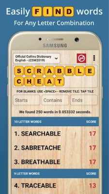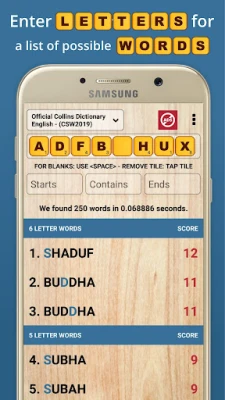Access helpful two-letter and three-letter word lists, including special cases such as Q without U, making it easier to find valid plays when space is limited.