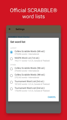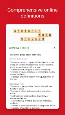 Features: - Official SCRABBLE® word lists: • Collins Word List - U.K. and International • Tournament Word List - United States, Canada, Israel and Thailand - Comprehensive definitions provided by The American Heritage Dictionary, Wiktionary, Century Dictionary, Collins Dictionary and more. - Works offline.