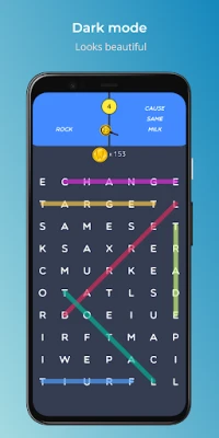 When you seek and finally find the word, it will be marked with a nice, colorful line. Each time, when your finger touches the first letter, a new color is chosen. It looks so nice, especially when the free night mode is enabled.