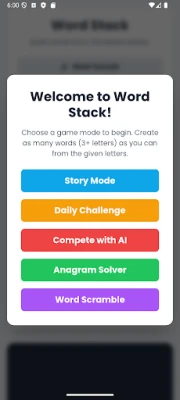 Story Mode: Embark on an adventure through progressively challenging levels. Daily Challenge: Compete against players worldwide on a new puzzle every day and climb the leaderboards. AI Competition: Race against a smart AI opponent in a thrilling head-to-head battle. Mini-Games: Test your speed and vocabulary in the fast-paced Anagram Solver and Word Scramble modes. With multiple ways to play, you'll never run out of word-finding fun. Download now and start your adventure!