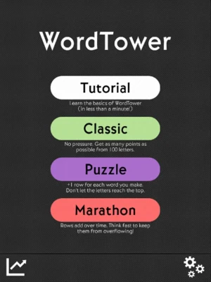 Word Tower have 3 modes: - Tower Mode: No pressure. Get as many points as possible from 100 letters. - Puzzle Mode: +1 row each time you want more letters. Don't let the letters reach the top. WARNING: Experts only! - Marathon Mode: Rows added over time. Think fast to keep them from overflowing!