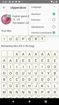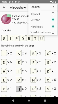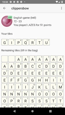 Keep track of the remaining tiles in all your Wordfeud matches! Approved for use in WLoH (Wordfeud League of Honour).