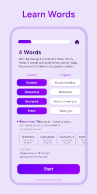 - Learn 4 French words at a time, with their meanings, examples, singular and plural forms, gender (masculine/feminine), and part of speech.