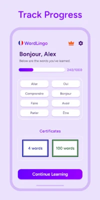 Earn 4 verifiable certificates as you progress: after 4, 100, 500, and 1000 words. Download, share, or print them.